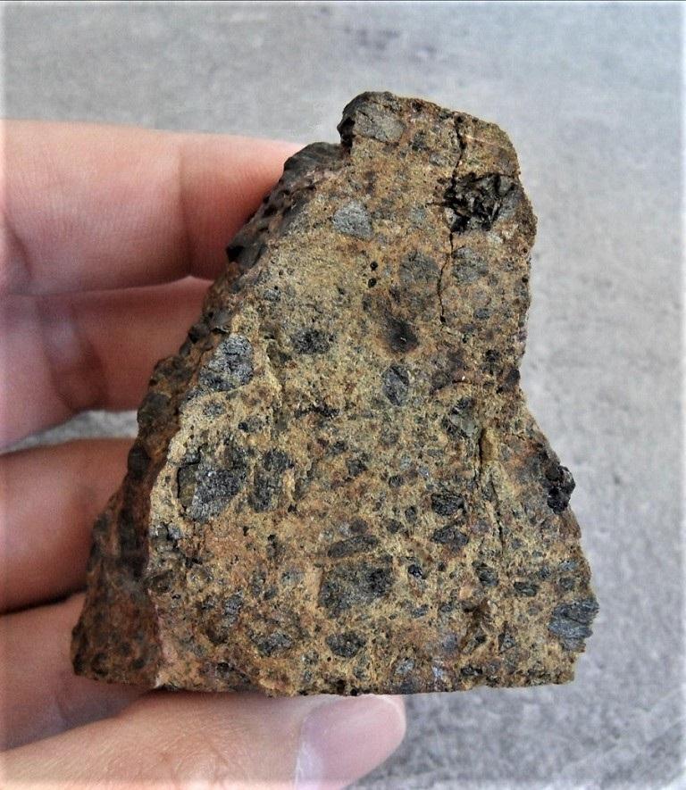 Décembre 2020 dans le sud du Maroc : une pierre céleste de 830 grammes a été découverte par un chasseur de météorites. Envoyée en France pour analyses, il s'est avéré qu'il s'agissait d'une chondrite H4. Elle a été publiée dans le Metbull le 23 août 2021 via le CEREGE, et j'ai pu l'acquérir dans la foulée. Une zone plus brune, quasi sans chondre et sans particule de fer/nickel, traverse la météorite de part en part. Il s'agit d'une magnifique IMB (Impact Melt Breccia) !